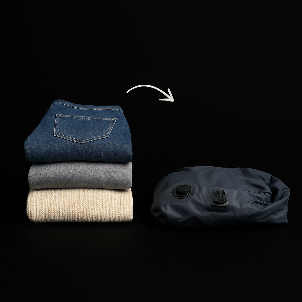 Compresse plus de 15 vêtements en quelques secondes Conception mince et modulaire qui s'adapte à n'importe quelle valise ou sac à dos Fabriqué en nylon durable et résistant aux déchirures Fermeture à glissière hermétique et étanche Garde les vêtements frais, propres et sans odeur Compatible avec notre pompe à air